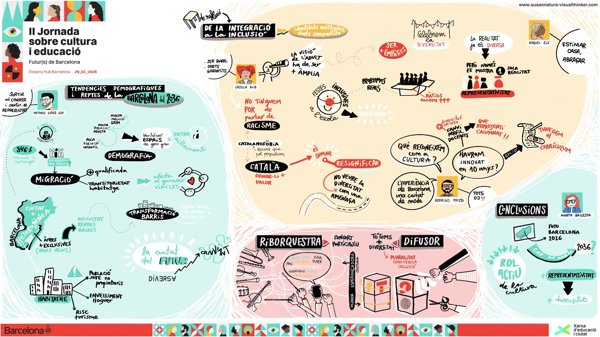 La Susanna té un do. Ha sabut captar a la perfecció l'essència de la II Jornada sobre cultura i educació, en directe, i plasmar les idees principals i les relacions entre elles amb el seu art tant original i captivador. Des de la Xarxa d'educació i ciutat, va ser un encert total comptar amb ella per fer la relatoria gràfica de la Jornada, tant pel procés, com pel resultat i l'impacte aconseguit en el públic. A més, el tracte amb ella ha estat amable, proper, honest i autèntic. Moltes gràcies!